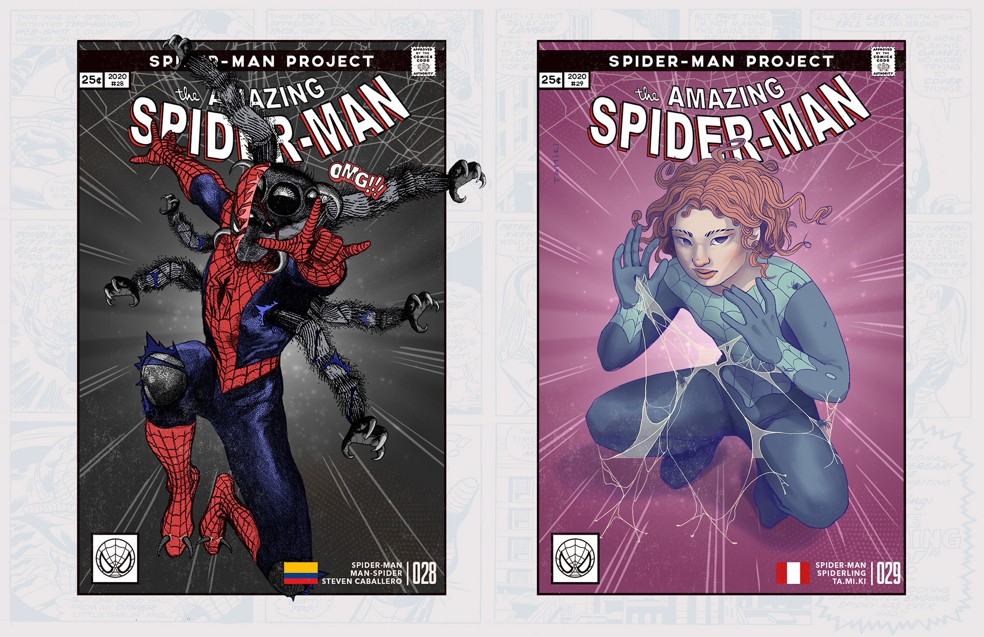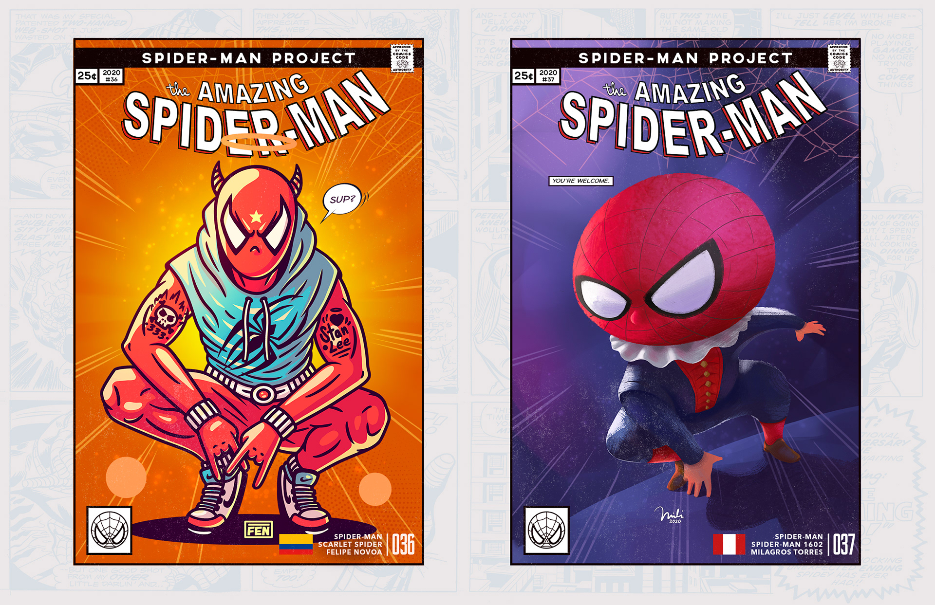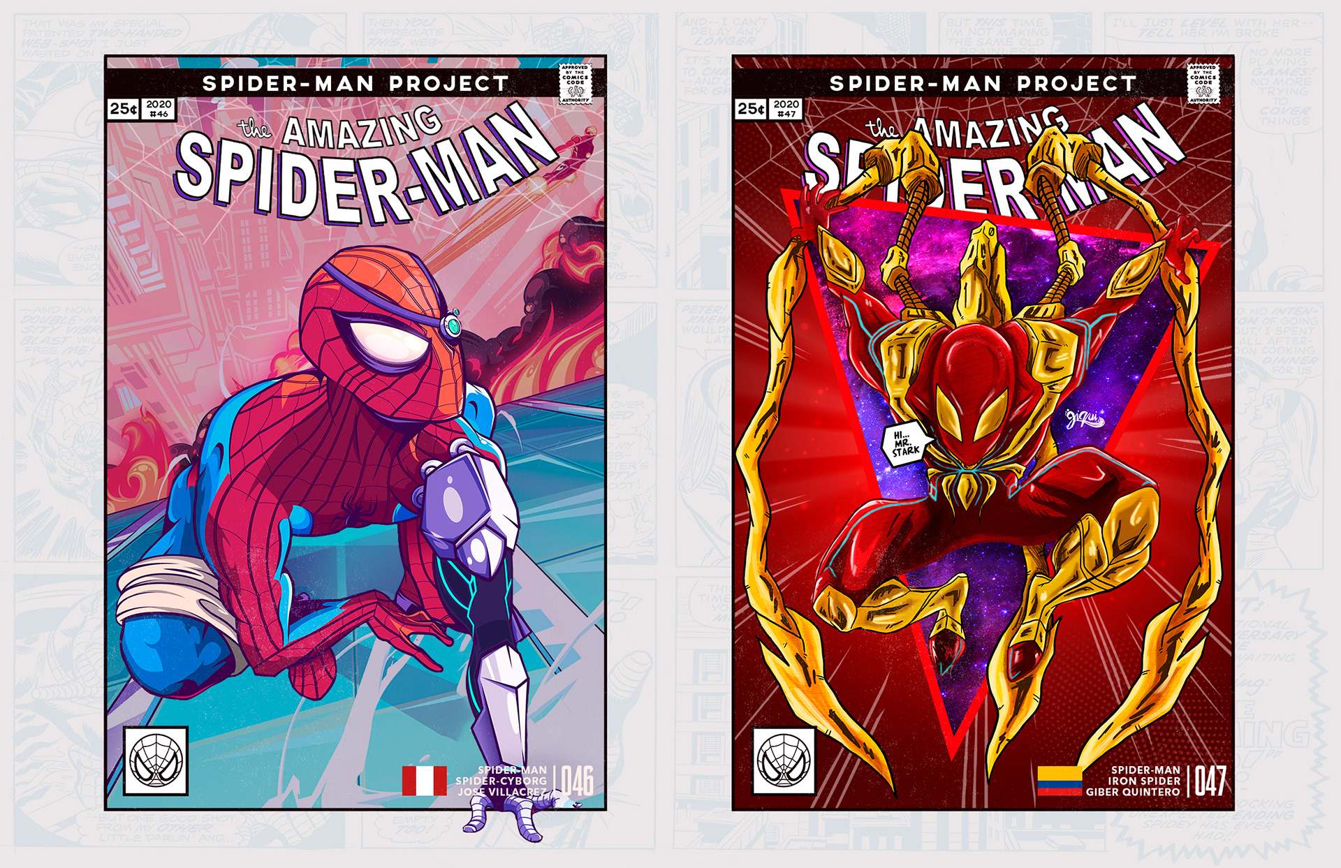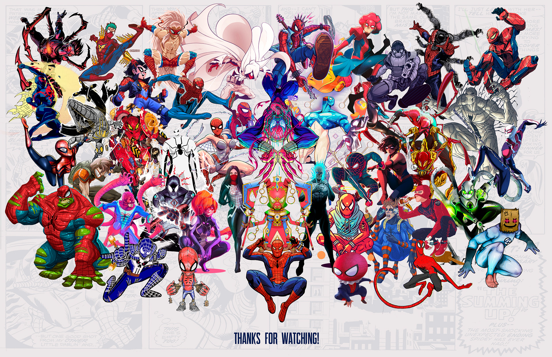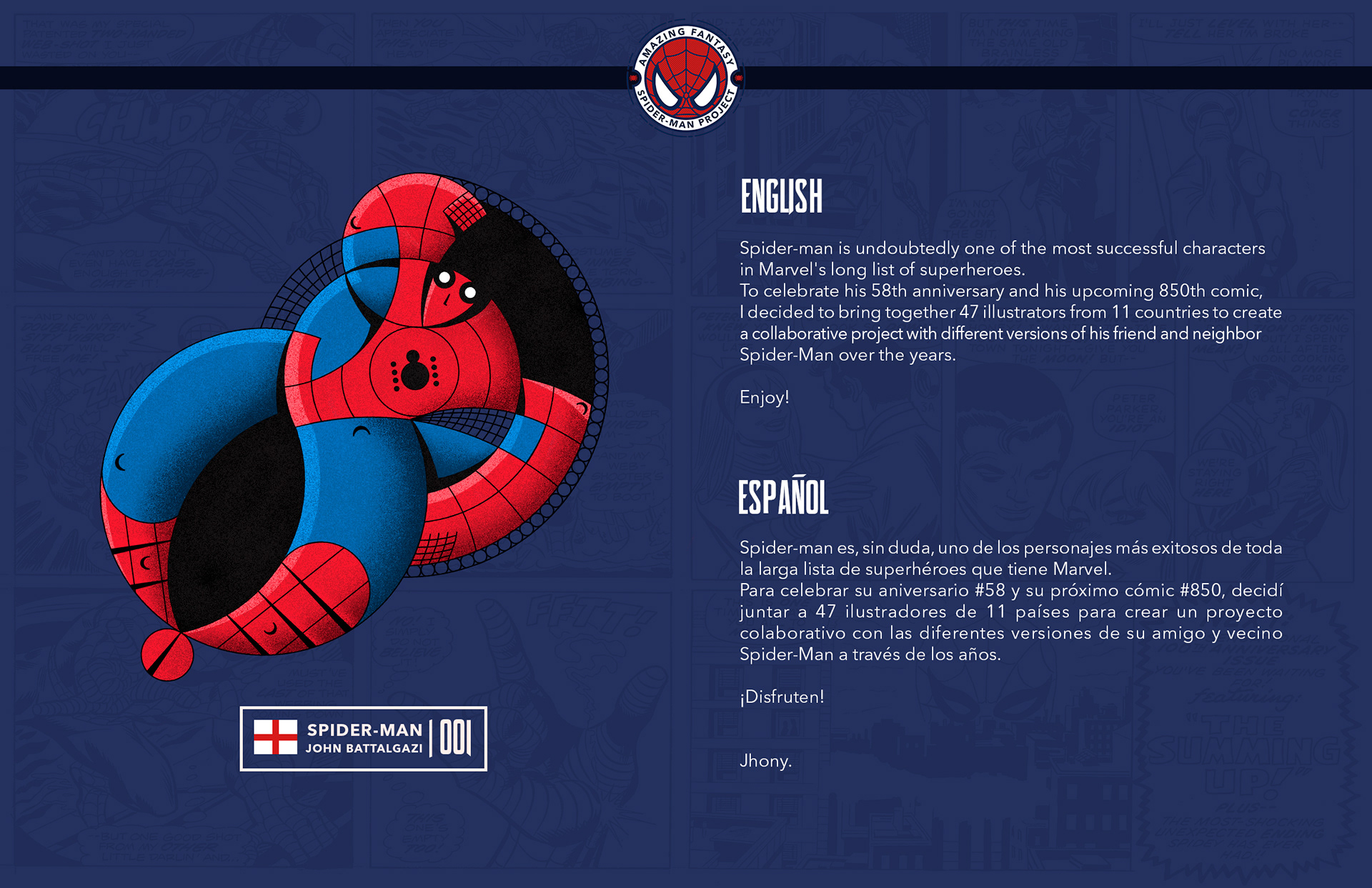 Spider-man is undoubtedly one of the most successful characters in Marvel's long list of superheroes. To celebrate his 58th anniversary and his upcoming 850th comic, I decided to bring together 46 illustrators from 11 countries to create a collaborative project with different versions of his friend and neighbor Spider-Man over the years. Enjoy! -------------------------------------------------------------------------------------- Spider-man es, sin duda, uno de los personajes más exitosos de toda la larga lista de superhéroes que tiene Marvel. Para celebrar su aniversario #58 y su próximo cómic #850, decidí juntar a 46 ilustradores de 11 países para crear un proyecto colaborativo con las diferentes versiones de su amigo y vecino Spider-Man a través de los años. ¡Disfruten! Jhony.